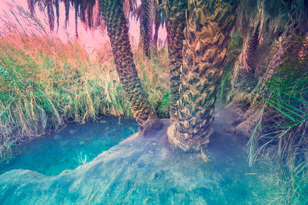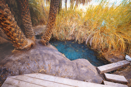 Beautiful waterfall with date palms at Chebika, Tunisia. No people, sunny day
