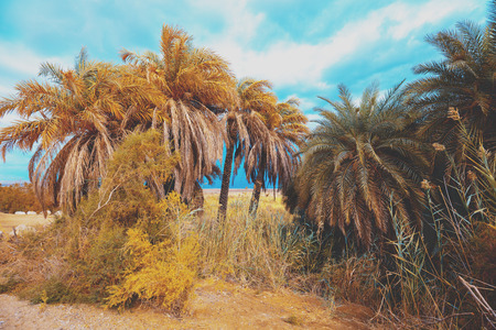 Tall palm trees are beautifully lit by the midday sun. Grove of date palms. The Judean Desert is a desert area in Israel located to the west of the Dead Sea. Israel.