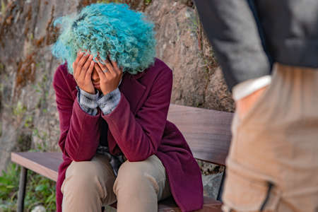 A teenage girl with blue hair is sad and depressed. Adolescent depression, headache.