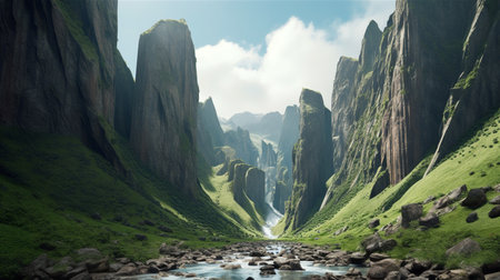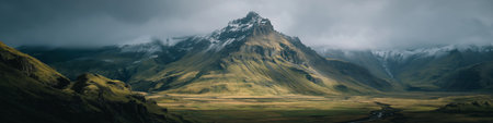 Lush green Icelandic valley with rugged mountains under a cloudy sky. Icelandic valley with impressive green mountains and dramatic sky