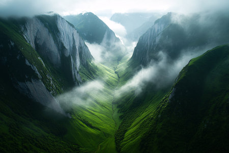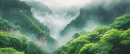 Misty mountains shrouded in fog, creating a serene and mysterious atmosphere.