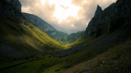 Morning light between trees and mountains, on the path to the lake of Frisson, in Maritime Alps Park, Piedmont Italy
