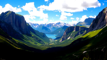 Panoramic view of beautiful alpine meadows and mountains in summer