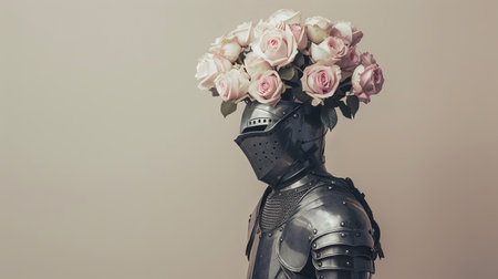 Knight in armor with flower crown, side view. Surreal and artistic concept.