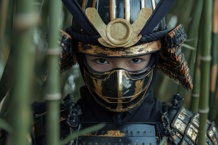 Portrait of a child dressed in traditional samurai armor and mask, proudly standing among tall bamboo canes in a serene forest setting