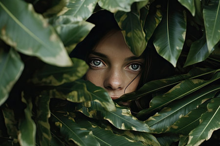 A womans eyes are visible through the lush green leaves of a tree, creating a unique and mysterious image. The leaves partially obscured her face, adding an element of intrigue to the scene.