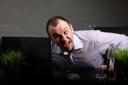 Spooky halloween zombie biting on laptop computer, having bloody scars and wounds on creepy dirty face. Frightening undead monster being aggressive with pc, looking dangerous cruel and deadly.