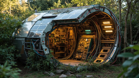 Futuristic solar powered bunker hiding in the forest