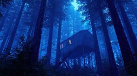 A cabin is perched high in a dense forest, illuminated by soft interior lights against a backdrop of deep blue. The image presents a low-angle perspective, emphasizing tall trees. The overall style suggests a digitally crafted scene, with potential use for conceptual illustrations, backgrounds, or creative projects, suggesting concepts such as solitude or adventure.