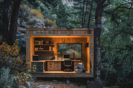 A small office cabin nestled in the heart of a dense forest, surrounded by trees, A remote mountain cabin converted into a workspace