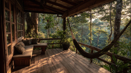 Cozy wooden cabin terrace with hammock, overlooking deep jungle greenery, morning sunlight casting warm tones across rustic wood