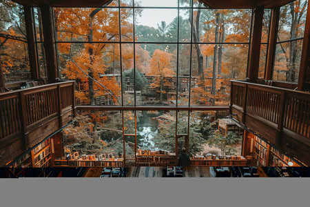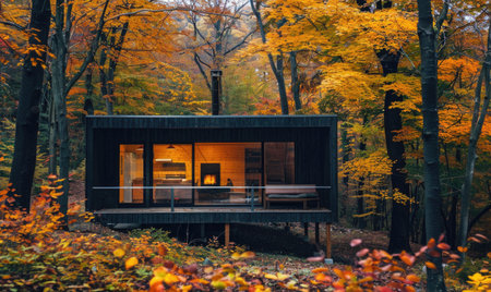 An inviting frame cabin with large windows sits amidst a colorful autumn forest, offering a peaceful retreat