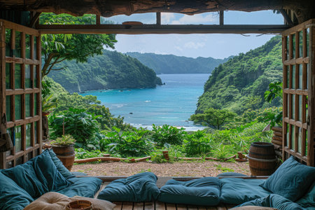 Inviting Cozy beach cabin. Sea island tree. Generate Ai