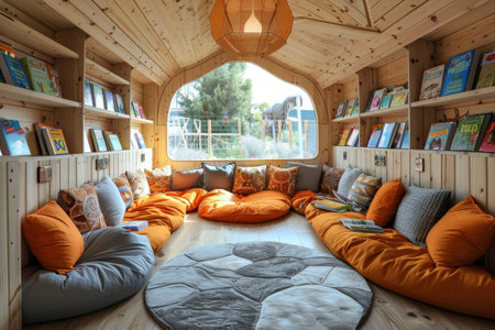 A bright and cheerful playroom with a large bookshelf filled with colorful books and a cozy seating area made of floor cushions.