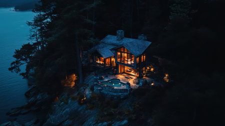This stunning lakeside cabin showcases modern architecture and warm illumination, nestled among trees, perfect for a tranquil evening retreat in nature.