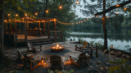 A serene riverside outdoor setting with a glowing firepit, festive string lights, and wooden seating, perfect for tranquil evenings.