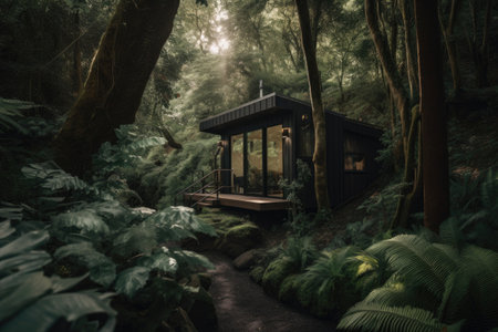 tiny home in the middle of a lush forest, surrounded by nature, created with generative ai