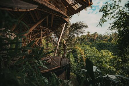 Blonde on balcony of a bamboo house in the jungle