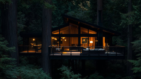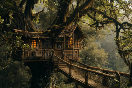Nestled high among giant trees, a rustic wooden treehouse glows softly in the evening light. Its warm interior invites relaxation, offering a tranquil escape into nature's embrace.