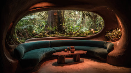 A tranquil interior features a curved green sofa and small wooden table. A large window offers a picturesque view of a lush forest scene. The warm lighting and earthy tones create a serene atmosphere. Suitable for a variety of uses, including editorial and design projects.