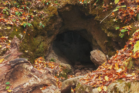 Large cave entrance in the autumn forest. Dungeon Gate