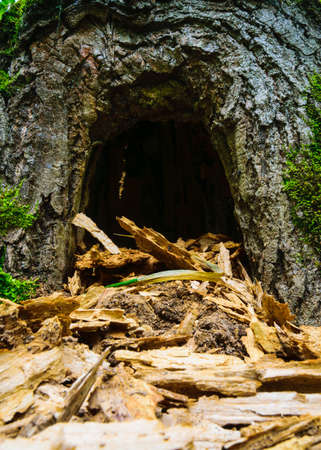 A hole in an old oak tree in the forest on a sunny day.