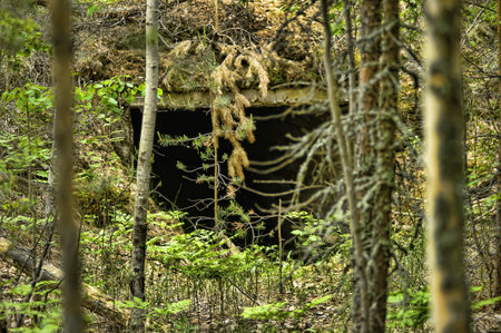 an abandoned concrete structure hidden in a dense forest, partially camouflaged by natural vegetation. The entrance to the structure is a dark opening surrounded by moss, dry branches and tree roots hanging from above. In front of it grow young pine trees, ferns and other forest vegetation. The atmosphere of the frame is mysterious and a little gloomy, with a hint of abandonment and a forgotten past. The picture conveys the feeling of a hidden object lost among the trees and can be associated with the theme of military history, bunkers or abandoned buildings.