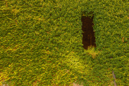 a window of ivy. The vegetation covers an old wall of ivy