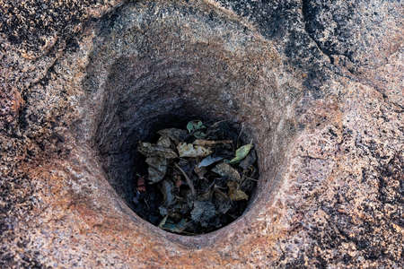 A natural hole in volcanic rock filled with old dead tree leaves in the Australian bush