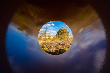 Perspective view trough concrete pipe, with shine durable ceramic glaze and large diameter for chemical waste, on building site with few cranes.