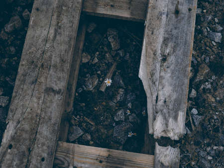 Flower in the middle of the wood, retro picture, old wood on the ground and flowers, wooden window or hole, daisy flower