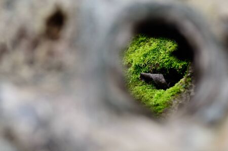 looking through a knothole in moss in the forest