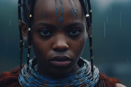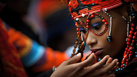 A woman with painted face and colorful beaded adornments gazes upwards, illuminated by soft light. The composition highlights vibrant colors, skin texture, and intricate details. The setting appears to be outdoors with a blurred blue backdrop, possibly suitable for cultural or artistic themed projects, or commercial advertising.