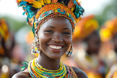 Portrait of a beautiful African woman wearing traditional colorful feather headdress and necklaces smiling