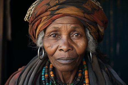 portrait of an old African American woman in traditional ethnic clothing and headdress