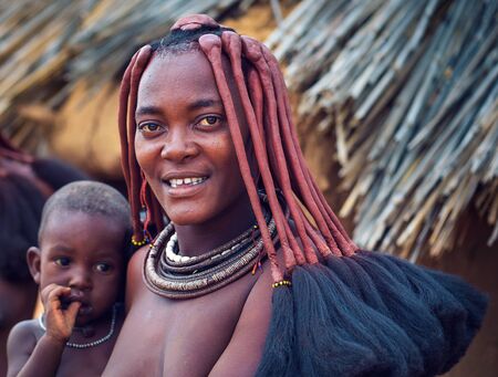 Portrait of a young himba woman with her child wearing traditional hairstyle