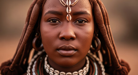 Opuwo, Namibia - Jul 08, 2019: Unidentified Himba woman with the typical necklace and hairstyle in himba tribe village