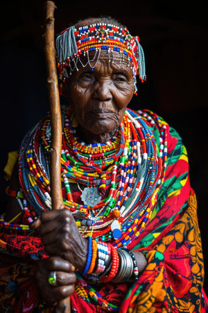Elderly African Woman in Traditional Beaded Attire Holding a Staff