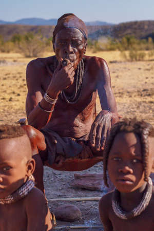 Opuwo, Namibia - Jul 07, 2019: Old Namibian man smoking a cigar, seen in Opuwo, the capital of the Kunene Region in north-western Namibia, Africa