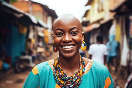 Portrait of a smiling african woman wearing traditional clothes at the market