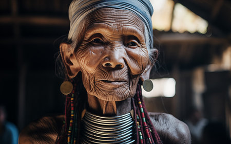 Close up portrait of beautifull aged old woman with sun and wind traces on a skin, deep wrinckles and sad eyes. Kayan group people mostly living in Myanmar in Southeast Asia.