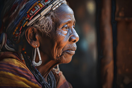 Senior woman in traditional clothing and jewelry, stands against a bold red backdrop, reflecting cultural identity and rich heritage in a captivating portrait
