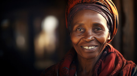 African woman radiates joy and confidence in traditional headscarf portrait generated by artificial intelligence