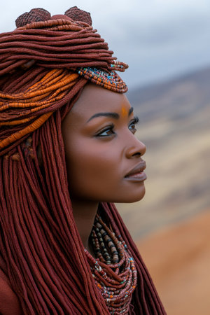 African woman with dark skin and beaded Fulani braids looking upward, expressing contemplation and strength