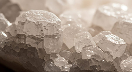 Macro photograph of translucent, faceted white salt crystals clustered together with soft light.