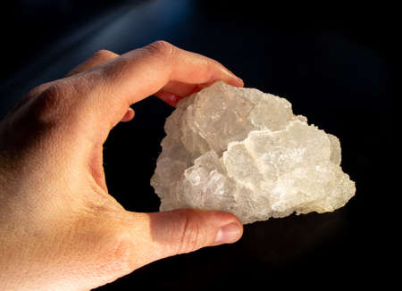 A hand holding shiny transparent white halite rock salt mineral crystal from Soligorsk, Belarus, in front of black background.
