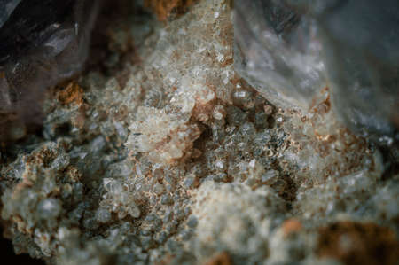 A sample of rock with amethyst under great magnification. Mountain mineral with crystals. Macro, horizontal composition