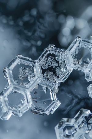 A close up of a snowflake with a hexagonal shape. The snowflake is surrounded by water droplets, giving it a sense of movement and fluidity. Concept of wonder and beauty