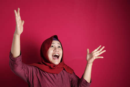 Portrait of happy muslim woman celebrating victory, winning gesture smiling and greeting something from above with copy space concept
