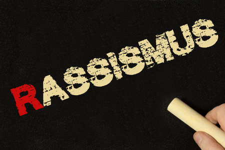 Word Racism made of wooden cubes with letters and black pawn among white ones on red background